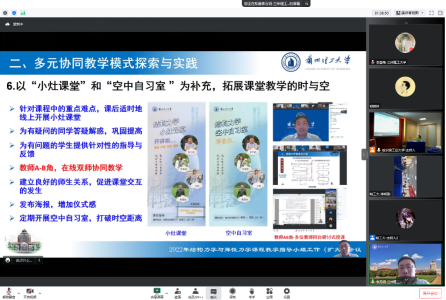 与会人员交流了疫情防控常态化以来各校在结构力学、弹性力学在新形态教学的经验和体会,就结构力学和弹性力学课程的历史与未来、教学教法改革、教学水平检测、以学生为中心的教学理念等问题进行了热烈分析和讨论,深入探讨了课程思政融合方式与虚拟教研室建设进展,为广大青年教师讲好弹性力学和结构力学课程提供了经验支持和精神动力。