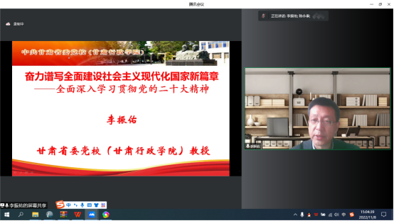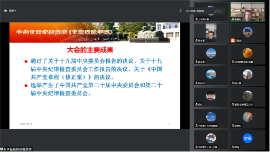 11月8日下午,土木工程学院通过腾讯会议举办学习贯彻党的二十大精神报告会,邀请甘肃省委党校(甘肃行政学院)马克思主义学院院长李振佑教授作题为《谱写全面建设社会主义现代化国家新篇章——全面深入学习贯彻党的二十大精神》的专题辅导报告。学院党委书记陈永泰主持,全院教职工及学生党支部委员200余人参加了报告会。