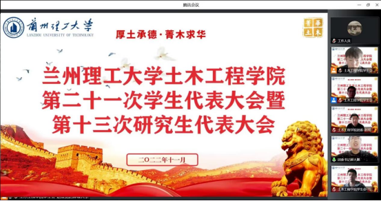 为全面学习贯彻党的二十大精神,落实落细学生会组织深化改革要求,兰州理工大学土木工程学院第二十一次学生代表大会、第十三次研究生代表大会于2022年11月28日在线上召开。学院党委书记陈永泰、学院党委副书记王仪杰等、校学生会主席团代表韩棕绘以及200余名本科生、研究生代表参加了大会。会议由院团委书记郝大鹏主持。