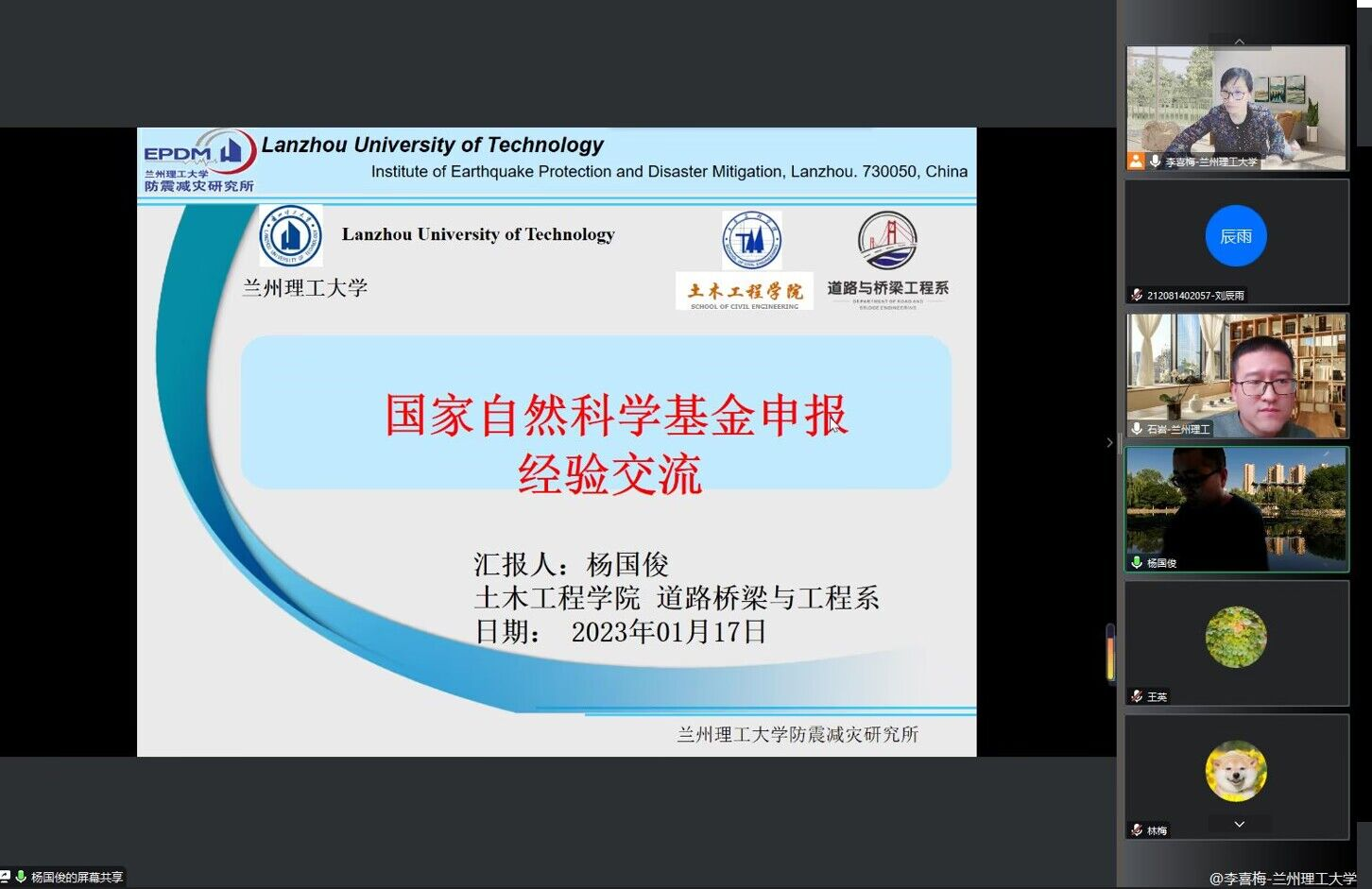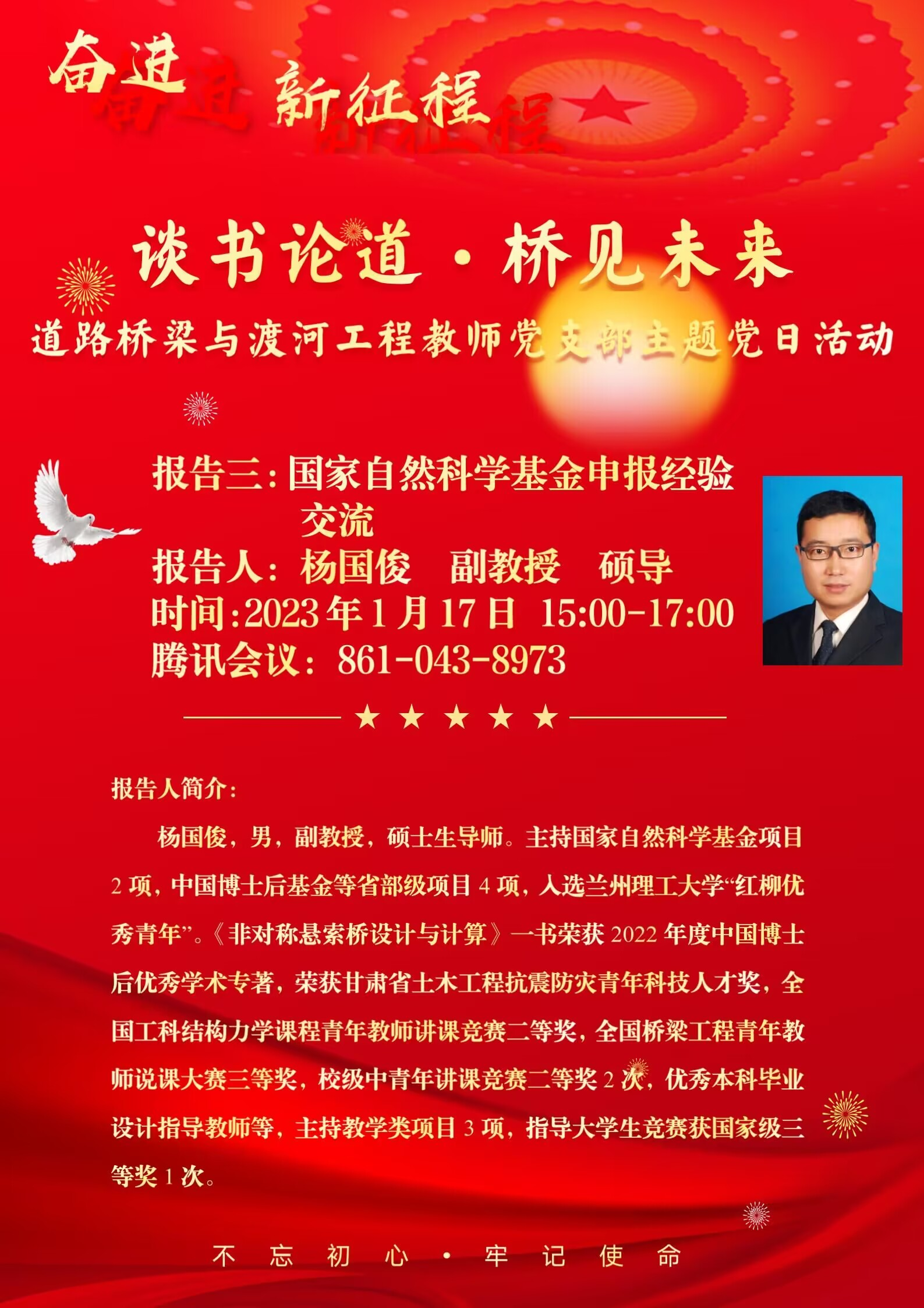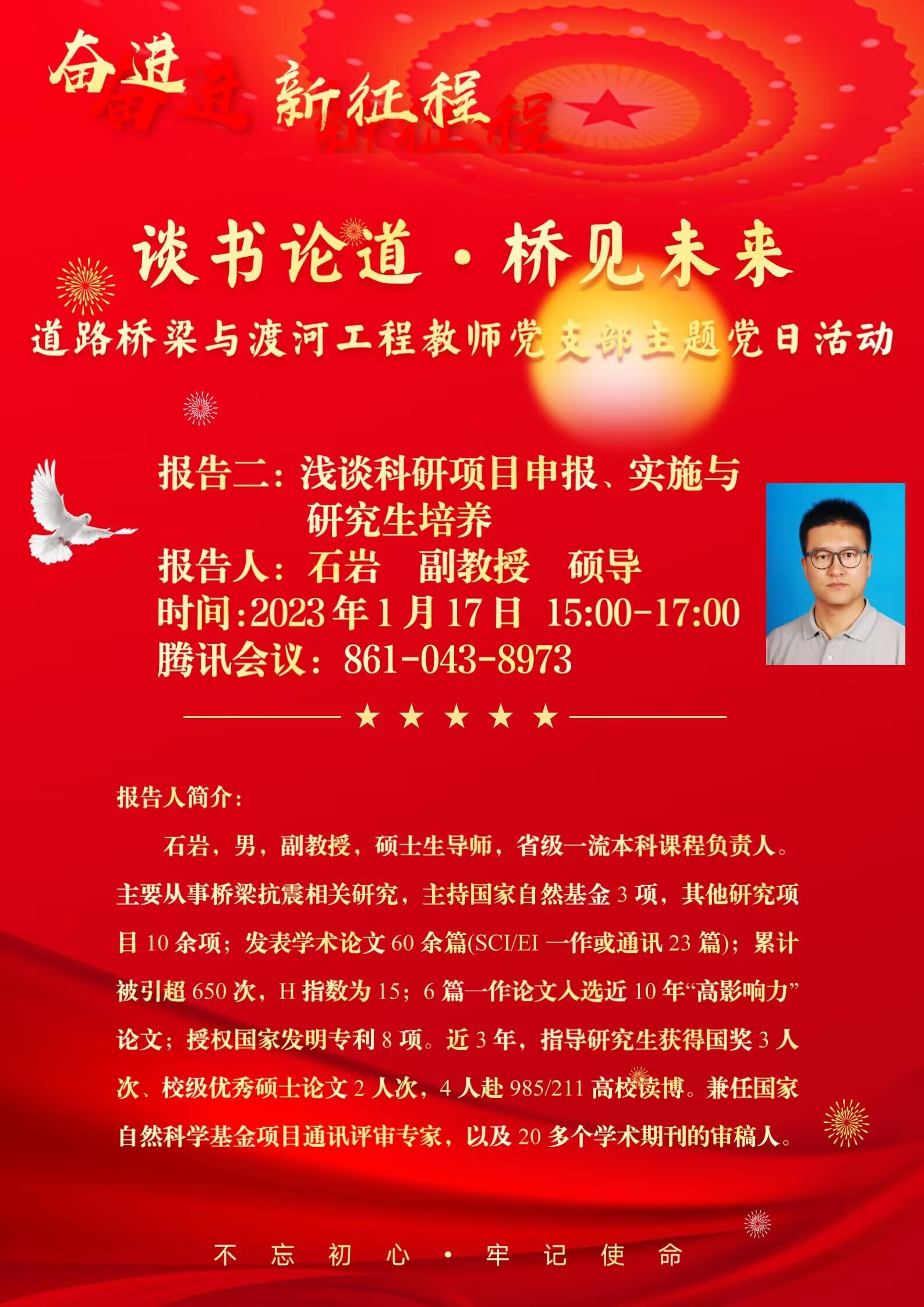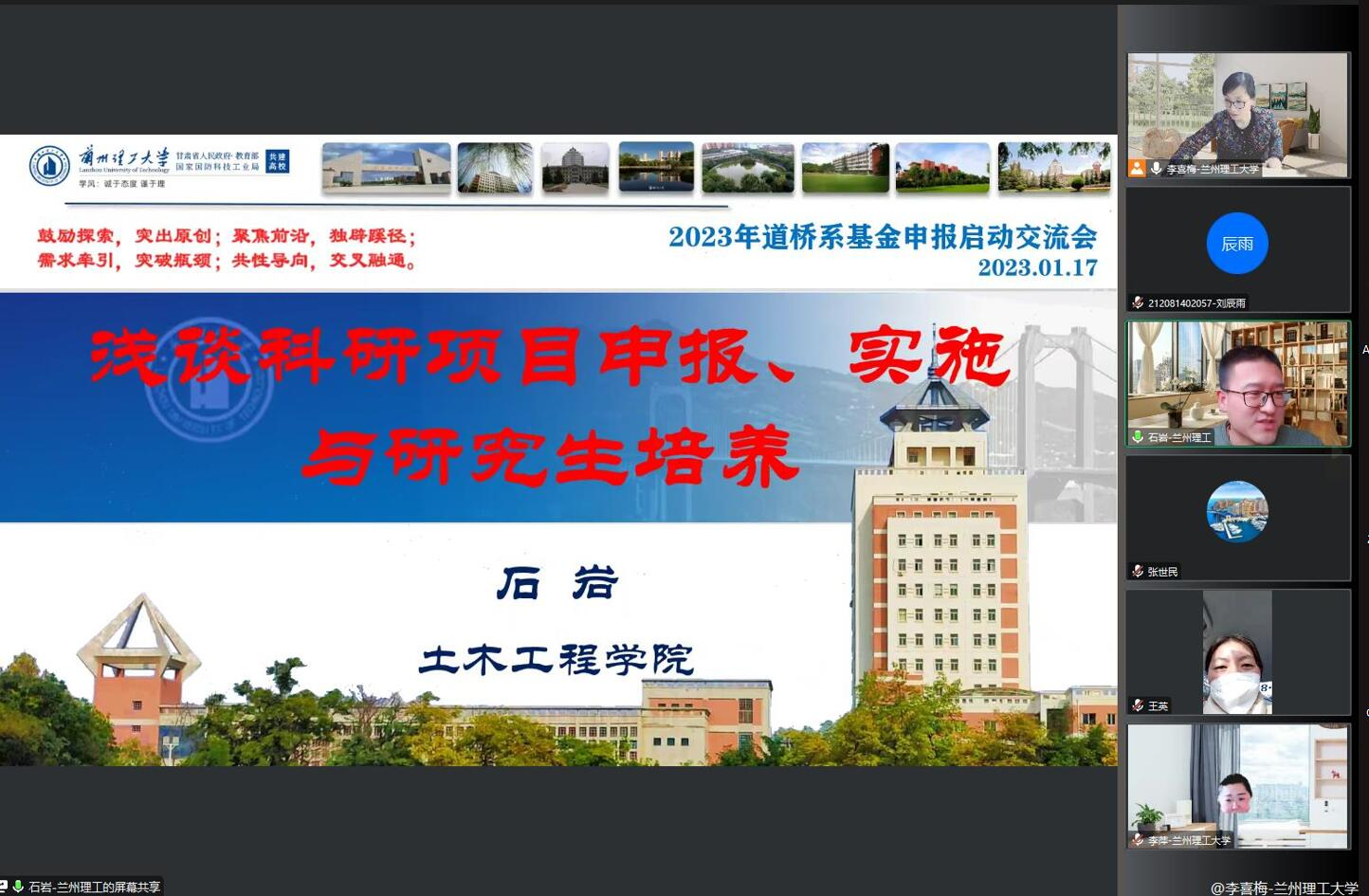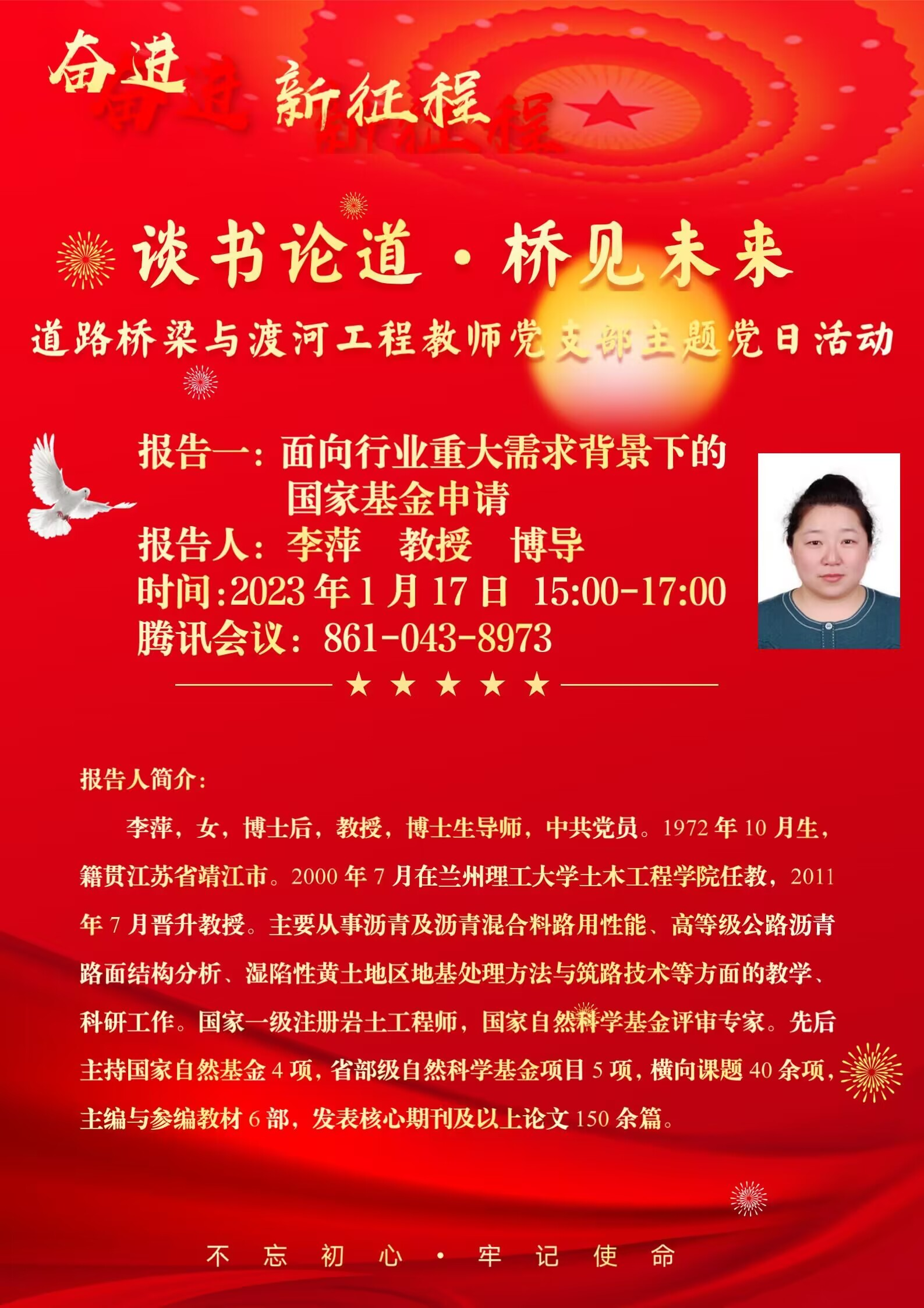 2023年1月17日下午,土木工程学院道路桥梁与渡河工程教师支部为推动党建工作和业务工作深度融合,开展了“谈书论道·桥见未来”系列主题党日活动,邀请支部党员李萍教授、石岩副教授、杨国俊副教授分享了国家自然科学基金申报及研究生培养经验,会议由支部书记李喜梅副教授主持,参会人员有土木工程学院副院长、教师党总支书记李万润教授、道桥支部全体党员、其他支部党员以及部分研究生党员等40余人参会。