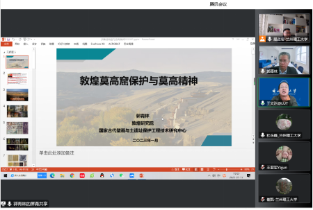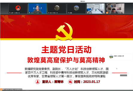 2023年1月17日下午,为了进一步深入学习党的二十大精神和省第十四次党代会精神,切实把思想和行动统一到党的二十大精神上来,铸就社会主义文化新辉煌。土木工程学院建筑工程教师第1党支部联合岩土工程教师支部、给排水科学与工程教师支部,邀请敦煌研究院研究馆员、文旅部优秀专家、国家百千万人才工程、兰州理工大学兼职博士生导师郭青林副院长,通过腾讯会议开展主题党日活动。建筑工程教师第1党支部书记殷占忠主持活动,学院院长王文达教授致辞欢迎,郭院长作了题为《敦煌莫高窟保护与莫高精神》的报告,3个支部全体教师党员参加活动。