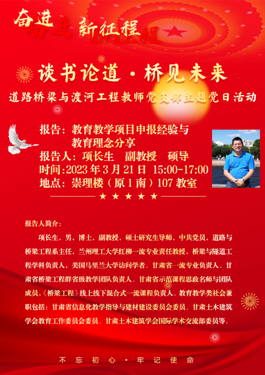 2023年3月21日,土木工程学院道路桥梁与渡河工程教师党支部在兰工坪校区崇理楼(原1号南楼)107教室开展了“谈书论道桥见未来”系列主题党日活动,道桥支部党员参加了本次活动。本次活动由道桥系系主任项长生副教授为大家带来了题为“教育教学项目申报经验与教育理念分享”的报告。