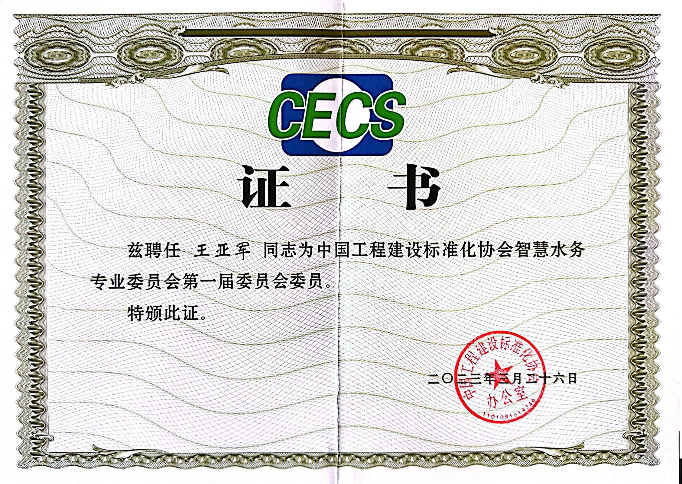 会上中国工程建设标准化协会李文娟主任宣读了中国工程建设标准化协会关于批准成立智慧水务专委会的决定,并选举产生第一届委员会主任委员、副主任委员和秘书长。宣布了委员名单,举行委员单位及委员证书颁发仪式。我校土木工程学院给排水科学与工程系王亚军教授获得了委员聘书。我校是西北地区唯一一个高校单位授予委员单位。