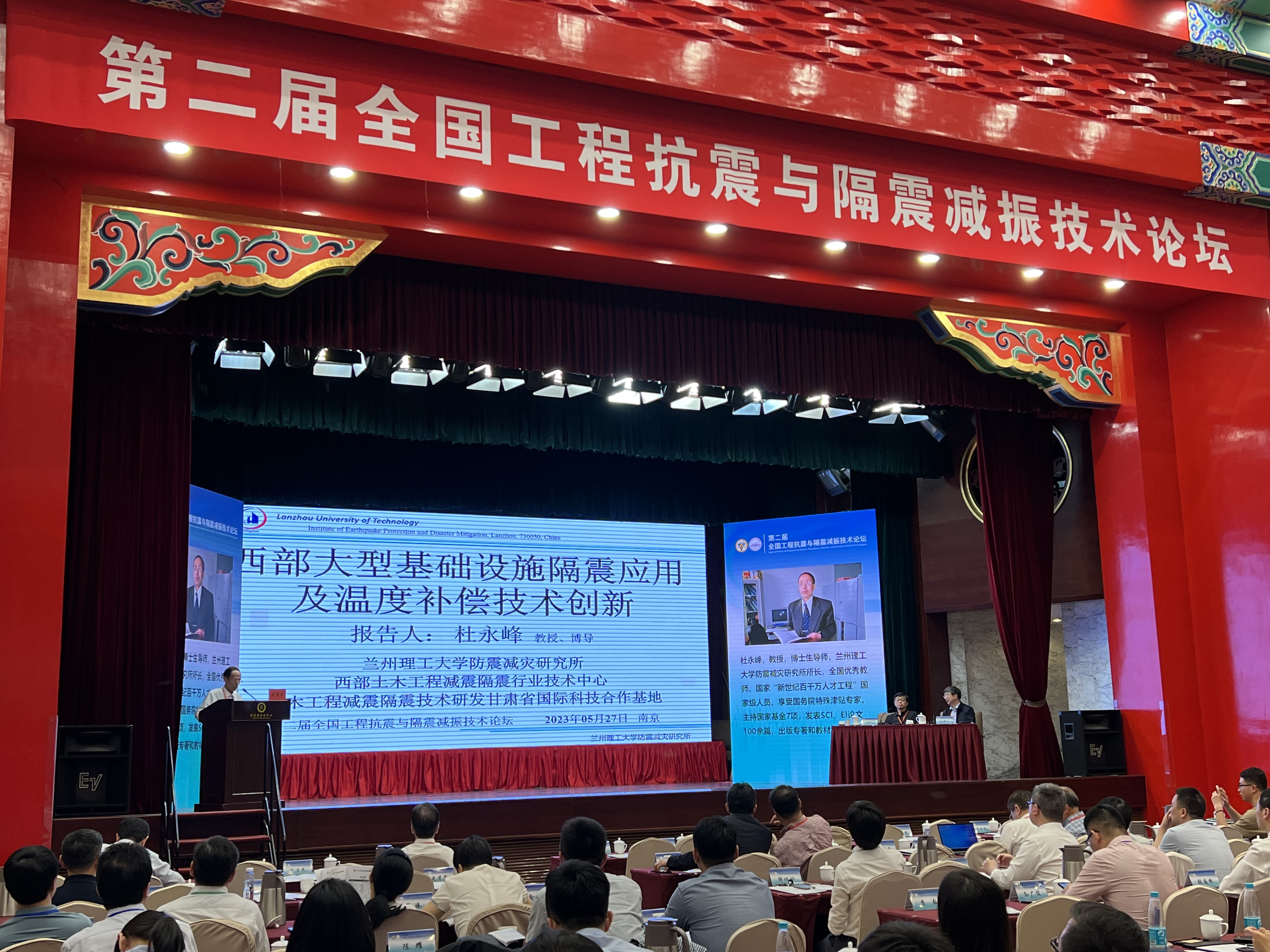 本次论坛围绕国内外工程抗震与隔震减振技术领域的重大工程技术难题开展学术交流,共安排了30场大会报告。中国土木工程学会防震减灾分会副理事长、兰州理工大学防震减灾研究所所长杜永峰教授和团队部分研究生代表参加了本次论坛。27日下午,杜永峰教授做了题为“西部大型基础设施隔震应用及温度补偿技术创新”的大会报告,并与业内专家和企业技术人员开展广泛交流。