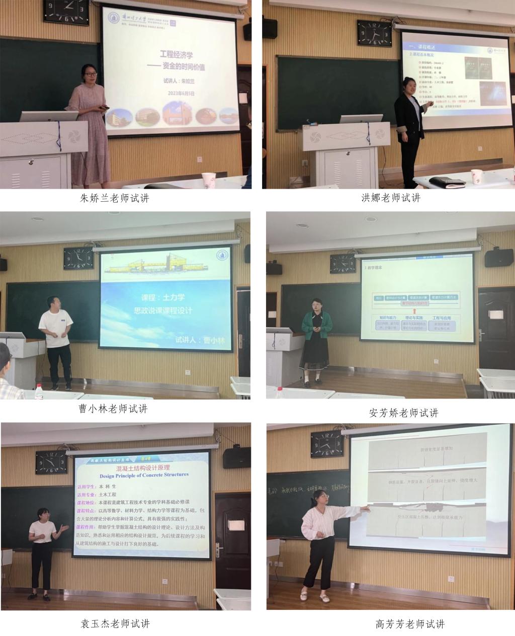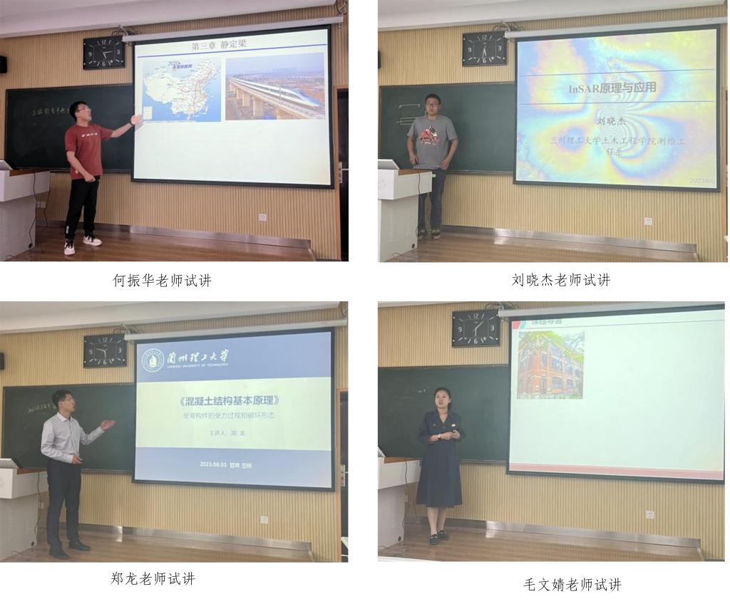 为进一步提高青年教师的教育教学水平,促进青年教师成长,土木工程学院于2023年6月5日下午在兰工坪校区崇理楼305教室组织了2023年教学观摩及新入职教师试讲活动。学院邀请了甘肃省第六届青年教师讲课竞赛校级入选者张秀霞副教授为新入职教师做了教学示范观摩,邀请了土木工程学院副院长李万润教授、省级教学创新大赛二等奖获得者王亚军教授、建筑工程系主任吴长副教授、测绘工程系主任牛全福教授、工程管理系主任刘平副教授担任评委,对新入职教师的讲课能力进行了评审。会议由吴长主持。