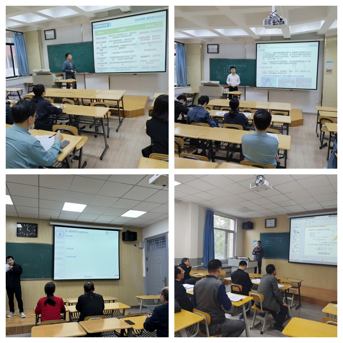 过程中,各位老师围绕课堂导入、课程思政融入、概念讲解、课堂提问、板书、总结等教学环节进行了介绍,并运用多媒体课件演示课堂教学。