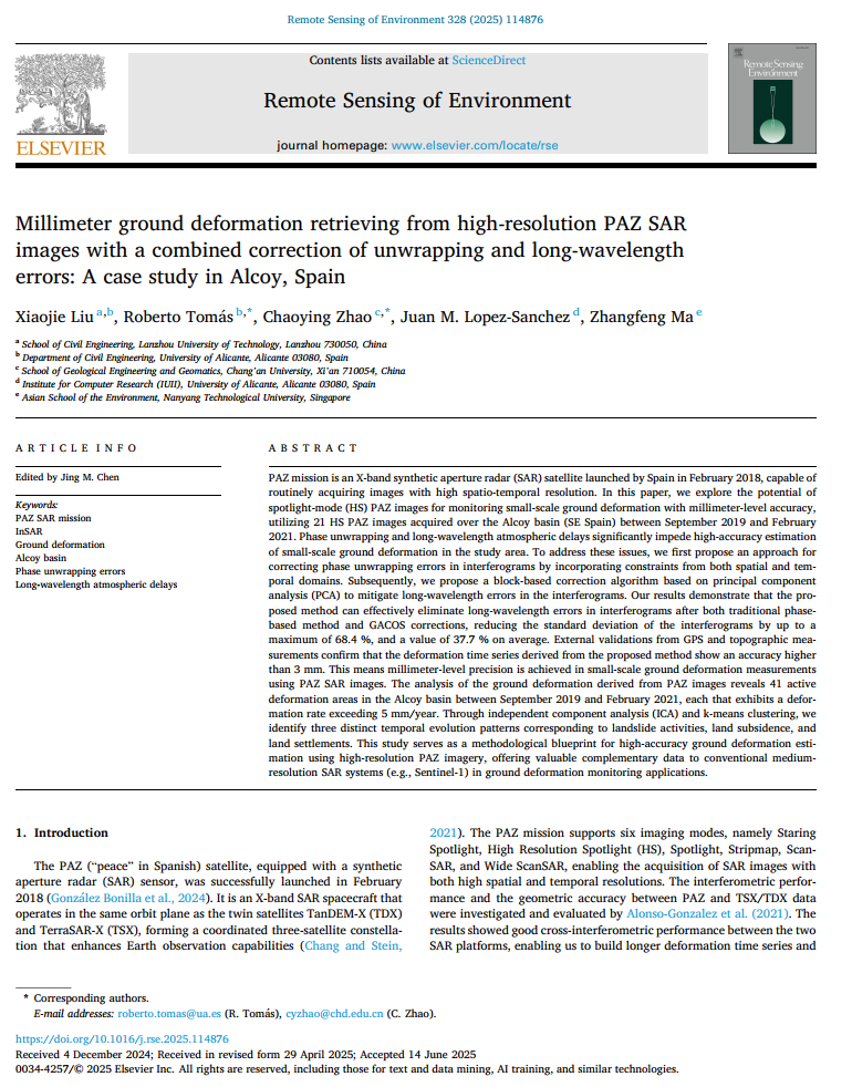 近日,国际顶级期刊《Remote Sensing of Environment》刊登了题为《Millimeter ground deformation retrieving from high-resolution PAZ SAR images with a combined correction of unwrapping and long-wavelength errors: A case study in Alcoy, Spain》的研究性论文,报到了我校科研团队在雷达遥感城市基础设施与地质灾害监测方面的最新研究进展。兰州理工大学土木工程学院为第一完成单位,学院青年教师刘晓杰博士为第一作者,合作单位包括西班牙阿利坎特大学、长安大学及新加坡南洋理工大学。《Remote Sensing of Environment》被公认为测绘遥感领域最权威的期刊之一,为国际顶级SCI-1区学术期刊,影响因子(IF)达11.4,CiteScore为22.60,在全球同类SCI学术期刊中长期排名前三。