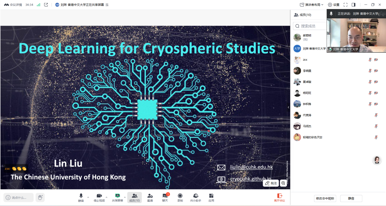 5月26日,应学院邀请,香港中文大学地球及环境科学系刘琳副教授在线上做了题为“Deep Learning for Cryospheric Studies”的学术报告,测绘工程系及相关学科师生20余人参加本次学术交流。