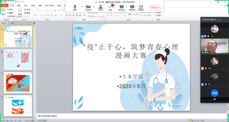 经过前期积极宣传,本次活动共计收到心理漫画作品81件、心理短视频36件,本着公平公正的原则,5月17日晚,学院团委樊洁平老师、院易班工作站杨金银老师及学院心理辅导站全体学生进行了线上评审,最终评选出心理漫画大赛一等奖2名、二等奖5名、三等奖8名;心理短视频大赛一等奖2名,二等奖3名,三等奖4名。