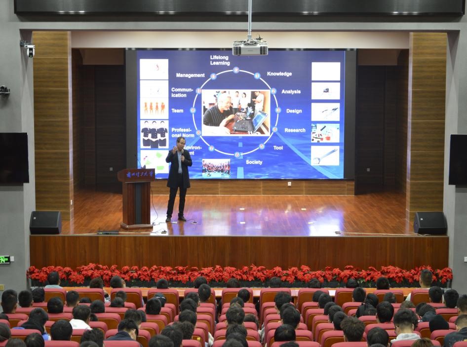本次讲座中。朱前坤教授首先从“我是谁”这个简明扼要,但铿锵有力的问题出发,把全体学生迅速带入聆听状态;通过习近平总书记对青年说的九句话,引申出学生该如何建立学习自信;最后结合土木行业发展与“一带一路”建设点明主题。他表示,当代大学生应具备矢志不渝的理想信念,求真务实的优秀品格,勇于作为的担当意识,勤奋好学的进取精神。要树立正确的奋斗目标,养成良好的学习习惯,提升自身专业素质和品德修养。通过大学四年的学习实践磨练自己的意志,把专业学习当作服务社会的天职,把奋斗理想变成自我价值的体现,勉励大家树立远大志向,全面发展,成长成才。