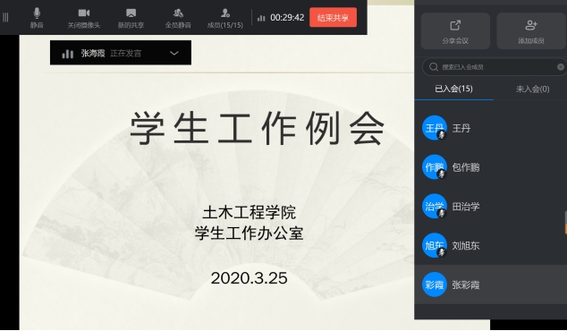 3月25日上午,土木工程学院依托“钉钉会议”软件、采取视频会议的形式召开了疫情防控主题学生工作例会。会议由学院学生办主任张海霞主持,学院党委书记田治学、全体辅导员参加了本次会议。