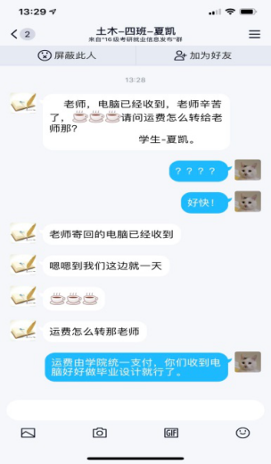 在疫情防控的“大考”面前,土木工程学院将继续做好学生全面的帮扶工作,全力保障学生学习生活,解决学生后顾之忧,做学生的坚实后盾和温暖港湾,帮助他们增强战胜疫情的信心与决心,为打赢疫情防控攻坚战贡献力量。目前,部分学生已经收到了邮寄的电脑,将利用电脑在家完成毕业设计、考研复试等工作。