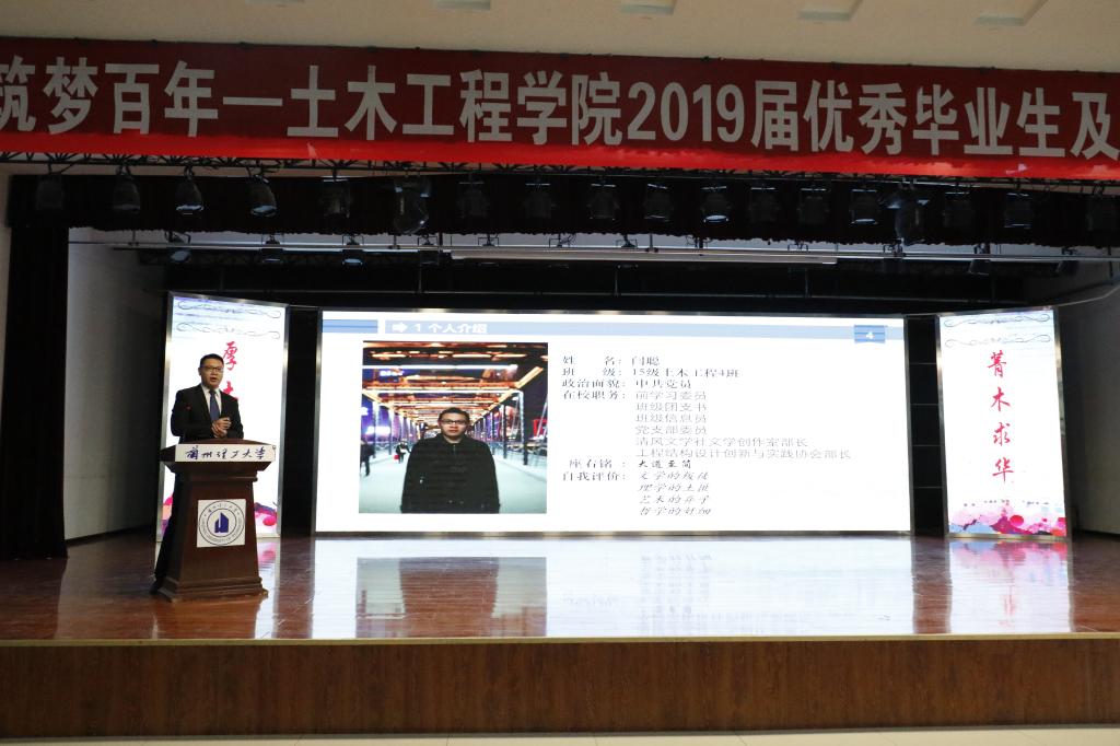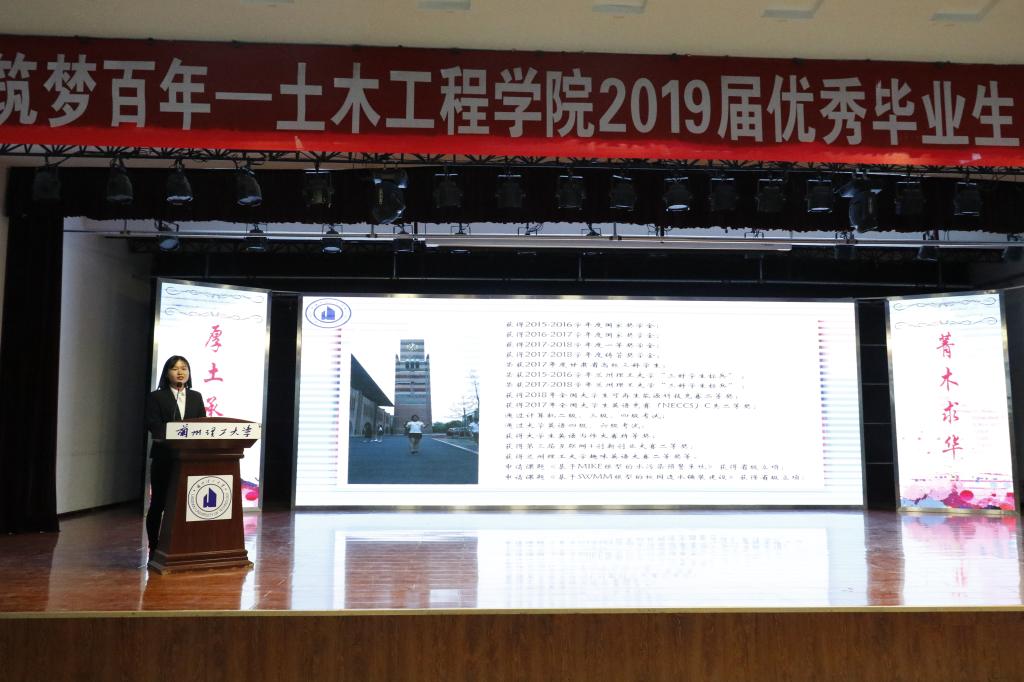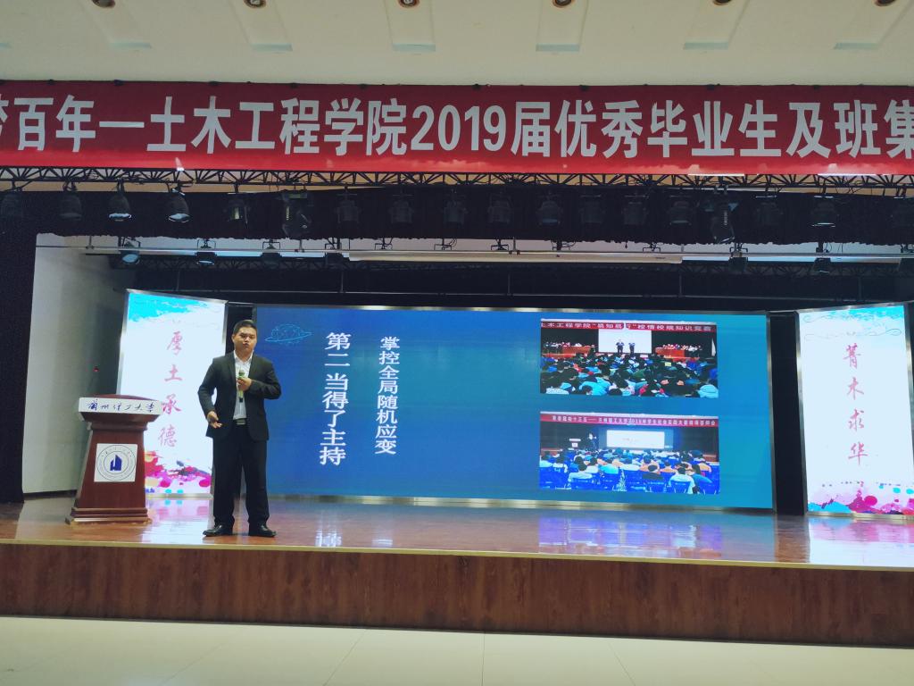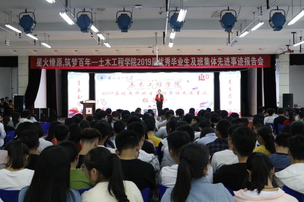 5月22日晚,土木工程学院在大学生活动中心三楼举办了以“星火燎原,筑梦百年”为主题的2019届优秀毕业生及班集体先进事迹报告会。报告会邀请到了2015级土木5班的夏彤彤同学、2015级土木4班的闫聪同学和2015级给排水科学与工程的余慧敏同学为在场的四百多名同学做了精彩报告和经验分享。